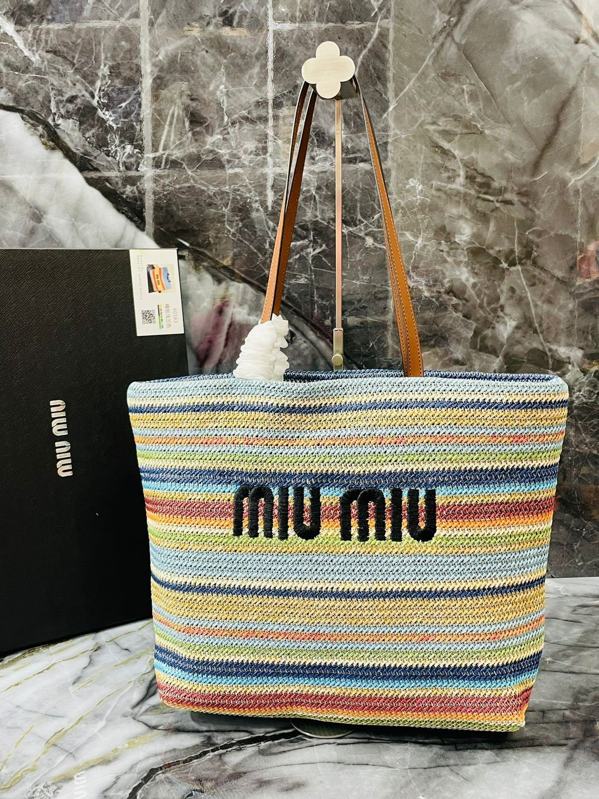 Dale un toque fresco y moderno a tu look con esta elegante cartera Miu Miu. Confeccionada en tejido de rayas multicolor, esta pieza destaca por su diseño casual y sofisticado. Cuenta con asas dobles en color claro y detalles en cuero marrón, perfecta para un día de verano, la playa o salidas informales.
